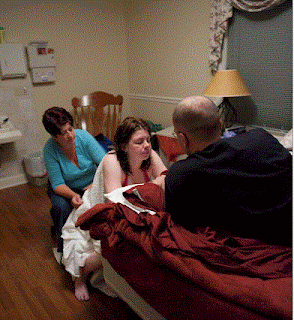 I focused on keeping my groans as low as possible and each one passed… not going to lie, birth was definitely painful at this place. I was having a quick HypnoBirth but I was not having a painless one. Another Ina May favorite of mine… she reminds us that Natural birth is honest pain. once it’s over, it’s over. I just had to power through this pain and it would be over. If I went across the street to the hospital and got medications or interventions now, I’d probably be in pain tomorrow, or even longer… my baby could experience pain or other ill effects of interventions- this was the safest and least painful place for us to be. I didn’t truly want to go across the street to the hospital per se, I just wanted to run away from the overwhelmingly intense sensations of the moment… then my thoughts went to our HypnoBirth instructor- she told us that at the point where you think you might want medication or that you can’t do it anymore or that you’re ready to give in, that’s your body telling you it’s about to happen… you’re about to have a baby, right then. Sure enough, seconds later the midwives both exclaimed, “Look at all that hair!” BG McD was crowning! I had been on my side as these pictures show, and wanted to move to shimmy her down a little bit if I could. My thighs were exhausted, my back was exhausted, but somehow I managed to get on my elbows and knees… bottom in the air. For what felt like an eternity (and John said was about 6 minutes) I felt our little girl inch down and slide back up with each crazy ridiculous intense contraction. I pushed with each big wave and attempted to suck in a quick breath and give it an extra Oomph at the end of each one, I kept hearing my midwives and doula telling me she was getting closer… the RN on-call was waiting with a warm blanket. Warm blankets mean we’re almost done, right? 🙂