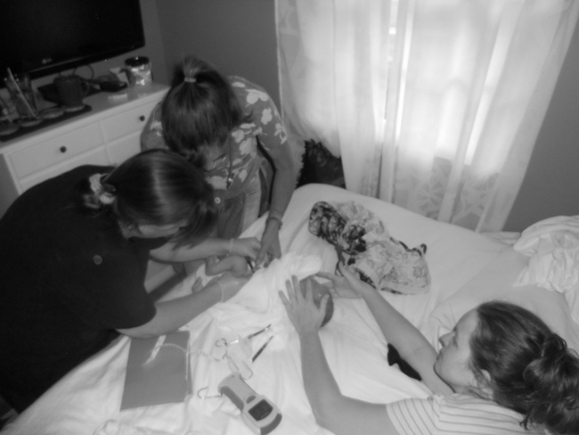 My mom woke up about that time and helped Tim get some things ready and tried to help me get through each contraction. I laid on the bed with my rice bag (throw it in the microwave = instant relief) and started vocalizing through the contractions. Oh, I was definitely in real labor.